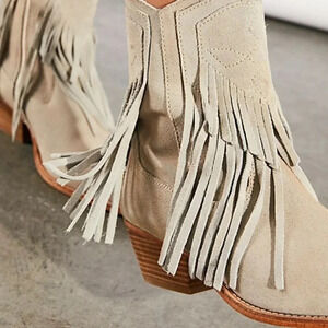 Let's dance! Fringe trim adds Western inspiration to a pointy-toe bootie lifted by a just-right block heel. Head west in these so-cool, western-inspired boots featured in an ankle-style and cowboy boot silhouette with a pointed toe and fringe detailing all over. Fringes dance when you walk. Comfy block heel adds height. Beautiful taupe color goes with everything!