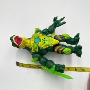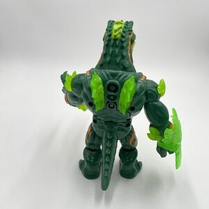 A green and yellow Alpha Beasts Alpha Rex dinosaur action figure with light-up features. This articulated toy allows for dynamic posing and imaginative play. The figure includes translucent green energy accessories for its arms. Perfect for playtime adventures and imaginative storytelling.