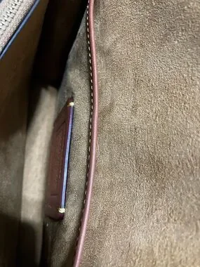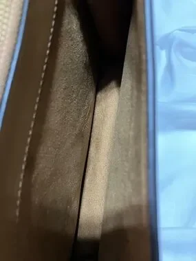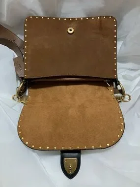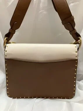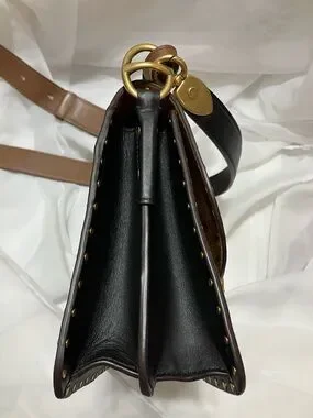 Colorblock Beat Bag style H2060 4595 in gorgeous colorblock with gold rivets. Has minor front center left blemish on white leather and discoloration on suede front lower left just below. Interior is very clean brown light suede; missing beat bag gold chain, in pre owned good condition. A front flip shoulder bag, stunning buckle. 9 3/4" (L) x 7" (H) x 4" (W).