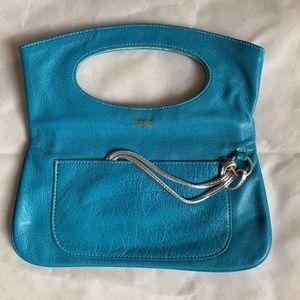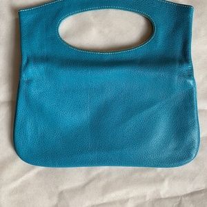 NWOT Never used turquoise with gold interior leather clutch with matching makeup mirror, super chic! With dust bag