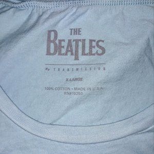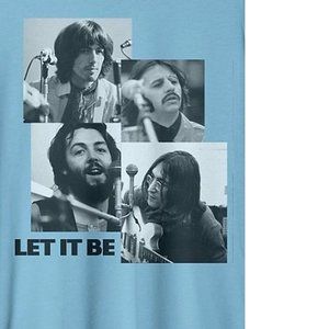 Light Blue cut-off top from Beatles with Let It Be design on front. Raw edges cut-off sleeves and hemline. Made in USA! 100% cotton.