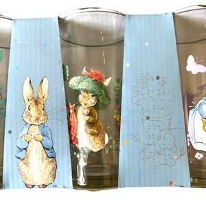 Bring charm and nostalgia to your table with this Beatrix Potter Peter Rabbit Bunny 16 oz Glass Tumbler Set of 4. Brand new and beautifully designed, each glass features a whimsical Peter Rabbit and floral motif, perfect for springtime entertaining or everyday use. Made of high-quality glass with a 16 oz capacity, these tumblers are ideal for fans of classic storybook characters and vintage-inspired kitchenware. Hand wash only. A lovely addition to any cottagecore, farmhouse, or Easter table setting!