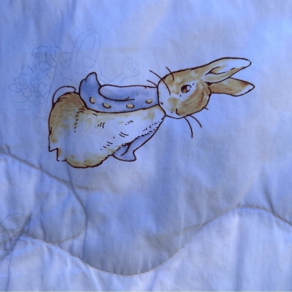 Beatrix Potter Peter Rabbit Quilted Toddler Quilt Blanket. White with Peter Rabbit, Flopsy, Mopsy & Cotton-tail, Mother Rabbit & Jemima Puddle-Duck all-over images. Faint Garden imagery and the quote, “You may go into the fields or down the lane, but don’t go into Mr. McGregor’s Garden”. The backside is plain white. Artistic quilting including squiggly lines and hearts. Good preowned condition with some cosmetic flaws. It has multiple ink marks and some light tattering on the edges from use and washing. It’s in otherwise good condition with a lot of life yet. Such a precious quilt, the pictures don’t do it justice! I thought this was Pottery Barn Kids, but it has no tags and material content is unknown.