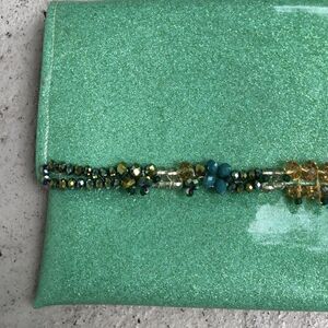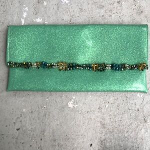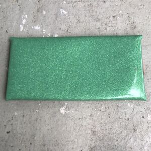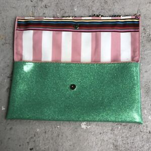 Check out the pictures. This is a sparkly green rubber bag with canvas interior. Measures across 13 x 6.5. Beading runs along the front.