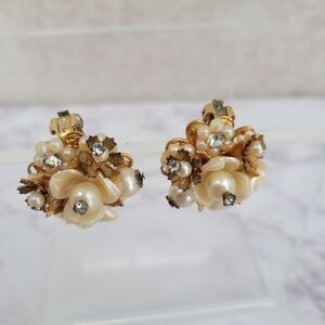 Vintage 60's 60s Gold toned clip on Earrings with clusters of faux pearls and rhinestones to look like flowers.