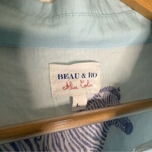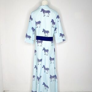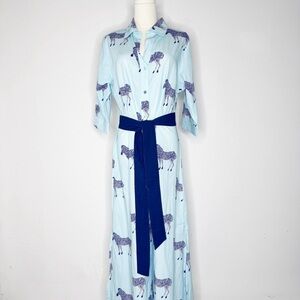 Playful meets polished in this charming button-down midi shirt dress from Beau & Ro by Alice Collin. Features a vibrant zebra print on a light blue cotton-feel fabric with 3/4 sleeves, classic collar, and a removable reversible belt (zebra print on one side, solid navy on the other) for styling versatility.