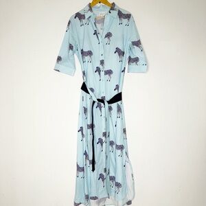 Beau and Ro, Alice Collin, zebra print dress, shirt dress, button down, cotton dress, animal print, reversible belt, novelty print, resort wear, casual chic, boho safari, coastal fashion, midi dress, size L, preppy style, Anthropologie style, vacation dress