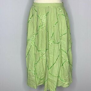 Beau Bois Linen Blend Midi Circle Skirt L Green Embroidered Sequins Pleats Lined