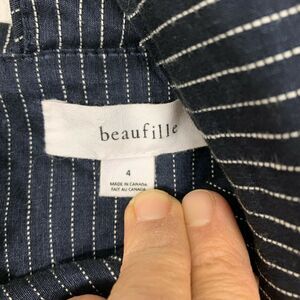 BEAUFILLE PINSTRIPE ONE SLEEVE CANOPY DRESS SIZE 4 NAVY LINEN BLEND STRETCH