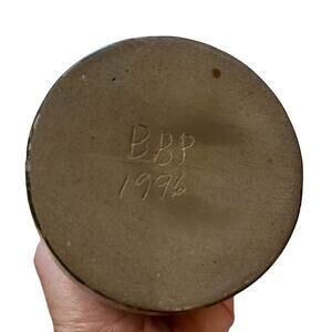 This Beaumont Brothers Pottery BBP jug or pitcher is a unique addition to any collection. Handmade in Ohio in 1996, it features a beautiful green gray salt glaze and a sponge pattern. The item stands at 4.5 inches tall and has a width of 3.5 inches, weighing 13 oz. No chips crabs or flaws to note!