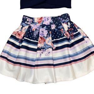 Beautees 2-Pc Twist-Knot Top & Printed Skater Skirt Set, NWT. Top had garment tag torn out but has never been worn. There is a small stain on the front right side of the skirt. I haven’t tried removing it due to still having tags. See last picture. Offers welcome.