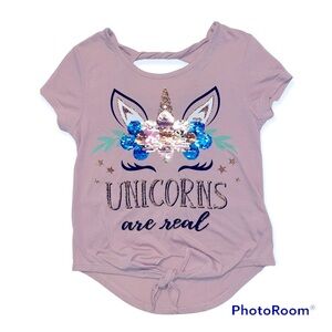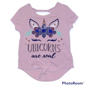 Description: Mauve Tie-Front Unicorn Flip Sequin Tee “UNICORNS are real”. Gently used, great condition.