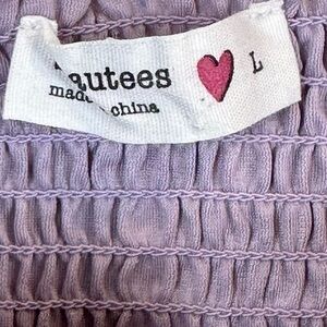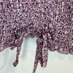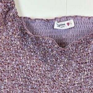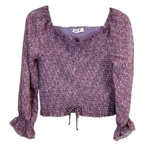 Beautees floral smocked crop top, women’s size Large (juniors fit). Features long puff sleeves with ruffle cuffs, smocked stretch fabric, adjustable drawstring hem, and cropped silhouette. Purple ditsy floral print. Great for casual wear, layering, or festival looks. Excellent condition.