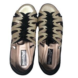 Step out in style with these stunning Beautifeel open-toe shoes! These heels feature a luxurious combination of gold and black suede, offering a sophisticated and elegant look. Perfect for a night out or a special occasion. You'll love the comfort and style of these Beautifeel heels!