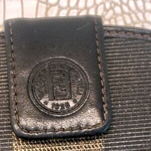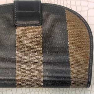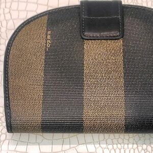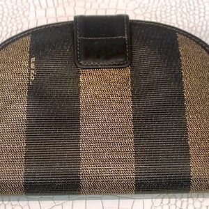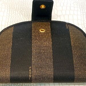 This beautiful 100% authentic women's Fendi Pequin snap wallet features a striped black design made from leather with the Fendi logo accent. It is a vintage piece from Italy, showcasing high-quality craftsmanship. The wallet is one size and includes credit card slots and a folding design, making it practical for everyday use. This stylish accessory is perfect for women who appreciate luxury and timeless fashion pieces.