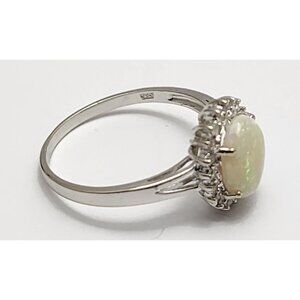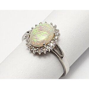Beautiful 14K Karat Solid White Gold Designer White Opal & Diamond Ring - Size 7