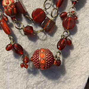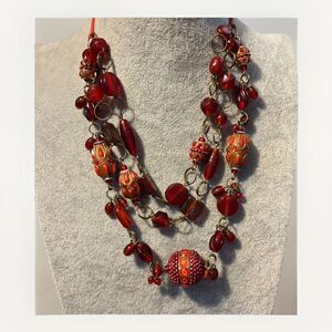 Beautiful 3 Strand Ruby Glass & Rhinestone Decorated Bead And Chain Bib Necklace