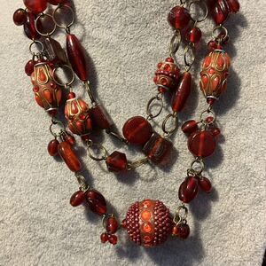This beautiful 3 strand ruby glass and rhinestone decorated beaded chain bib necklace is a stunning statement piece perfect for various occasions such as engagements, weddings, birthdays, and anniversaries. The necklace features vibrant red glass beads and rhinestones, accented by a lobster closure for easy wear. With a necklace length of 16 inches, this piece exudes a bold and bright beauty, making it a standout accessory in any jewelry collection.