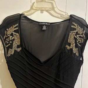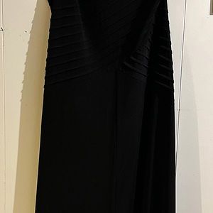Gorgeous, long black dress with see thru back and arms. Gold accents makes this a stand out piece!