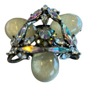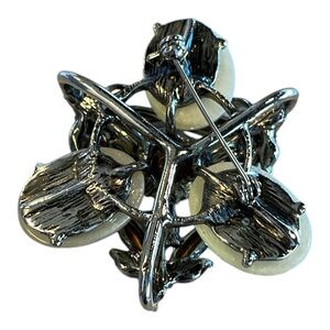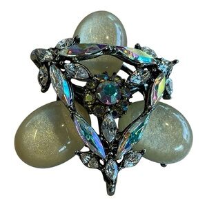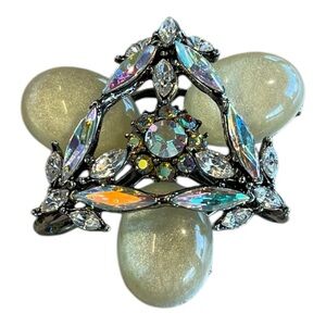 This brooch features a trio of lustrous off-white cabochons arranged in a triangle, each surrounded by delicate metalwork resembling leaves and petals. The center of the brooch is adorned with a cluster of sparkling iridescent crystals in various shapes and sizes, creating a dazzling focal point. The overall design exudes a vintage-inspired elegance with a touch of floral charm.