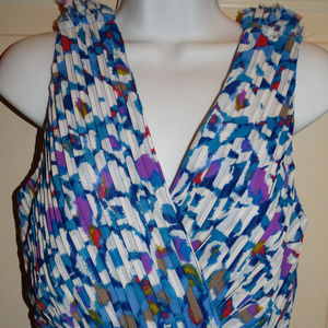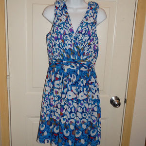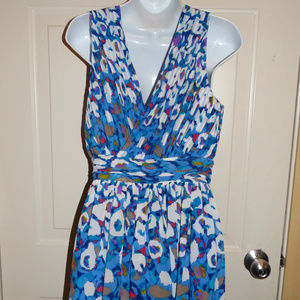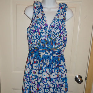 This is for a beautiful dress made by Matthew Williamson made for Macy's in a size 8. The dress is in great condition. The dress is a blue color with white and shades of red, purple, brown and yellow. The dress has a side zipper and a lining.