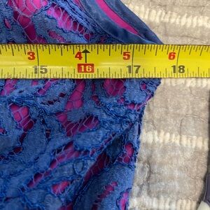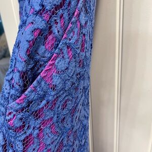 Beautiful dress with lace overlay hot pink and blue purple combination make it such a beautiful dress. Dress has pockets for all the essentials. Cocktail party or wedding dress attire