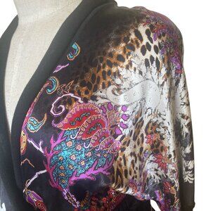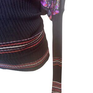 This pullover blouse combines knit and a beautiful, mostly black with bright mixed-print, dolman-style long sleeve that drops to a knit.