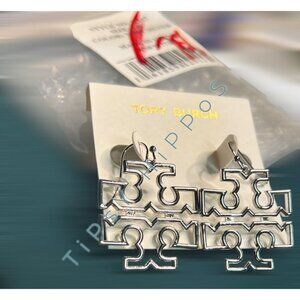 Beautiful Authentic Tory Burch Silver Britten Logo Drop Hoop Earrings