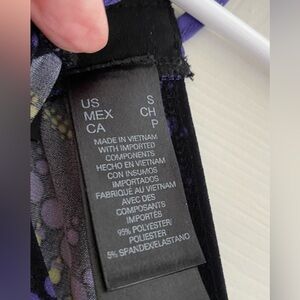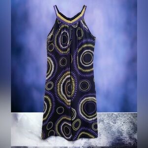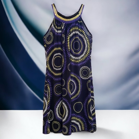 Gorgeous dress with purple, black and green colors. Keyhole back with button closure. No flaws.