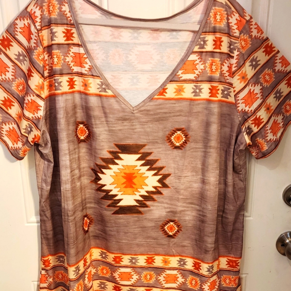 Aztec designed shirt, short slv. t-shirt style, 100% Polyester top, made in China. 5XL true to size. worn one time, too big for me. Beautiful coloring in Design.