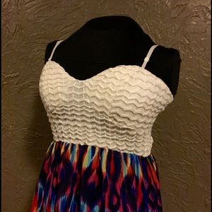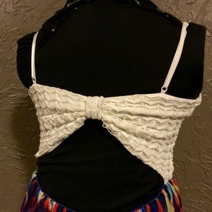 Absolutely stunning bright and rich colors with complimentary cream upper area. Unique bow style back, adjustable shoulder straps. Has a slip under skirt that ends just above knee area for modesty. Brand be without tags.