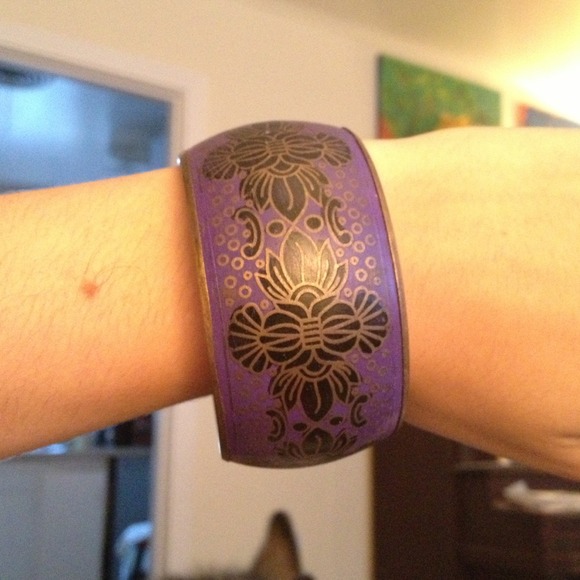Purple bangle with black and gold design. About 2" x 1 1/2".