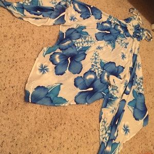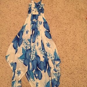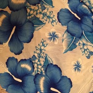 NWOT. I purchased this One Size dress and was unable to wear it because it was too small. It is labeled as one size fits all, but fits like a small/medium. It is lightweight, flowy, and has a beautiful royal blue hibiscus flower design, perfect for the beach or vacation! Extremely comfortable! I am 5'5" and it cuts at just above the knee and at about mid-calf