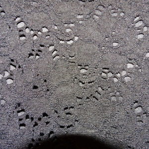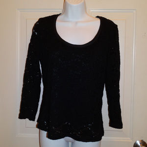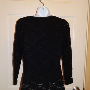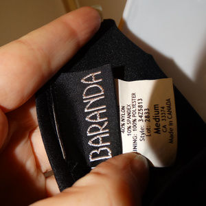 This is a beautiful black blouse with a cut out design, it is lined except for the arms. The shirt is 50% Rayon, 40% Nylon and 10% Spandex with a 100% polyester lining. The shirt is made by Baranda , made in Canada and is a size Medium. It is in good condition.