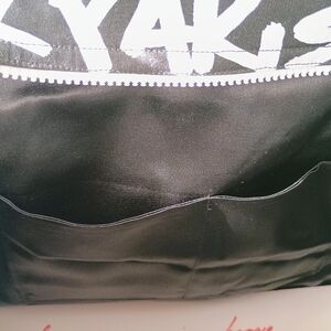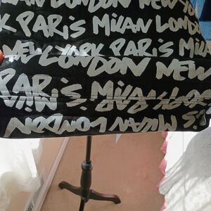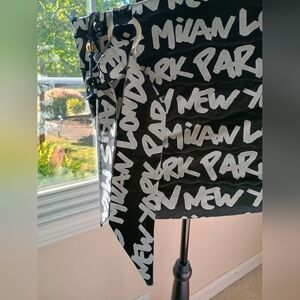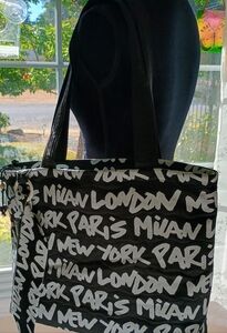 Stylish tote bag with bold city names in black and white. Perfect for a complete look. Imagine white jeans or a skirt, a black tee and this gorgeous bag. Has a zippered pocket inside and two open pockets. Spot clean only. The bow on the outside has satin on one side. There's also a beaded hand pull. Handmade with care. A stunning piece of sewing with lots of attention to detail. Would make an amazing gift. The price is firm.