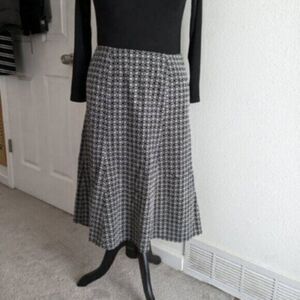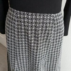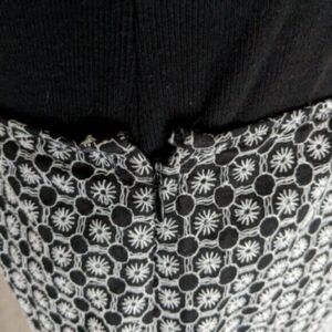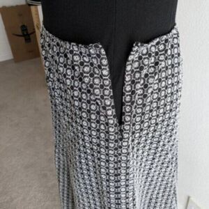 Nine West Black skirt with white embordered design, on the fabric. This skirt is so pretty and in very good pre-owned condition. Concealed, side zip with hook and eye closure. The tag says it's a size 10 but it wears a good bit larger, I think. Please see measurements.