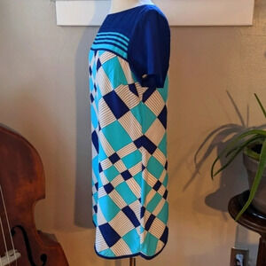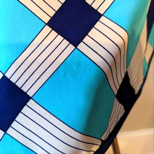Amazing pattern with a geometric feel, blue, turquoise, white, colors. Short sleeves, boat neckline.