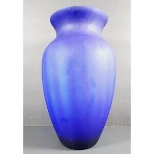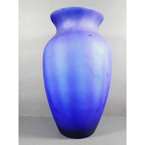 Beautiful blue frosted glass vase - would look pretty on the shelf, but this piece really shines its best in the sunlight. Hard to capture in photos, but there are lighter and darker stripes in the blue. Some areas show some slight signs of wear as seen in pictures, but there are no cracks or chips. 10.5" tall and 6" wide at the bottom. Gorgeous piece to add to your collection!