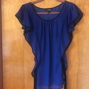 Gently loved & worn only a handful of times. Beautiful royal blue ruffled blousy shirt with black tie belt. A. Buyer, size large.