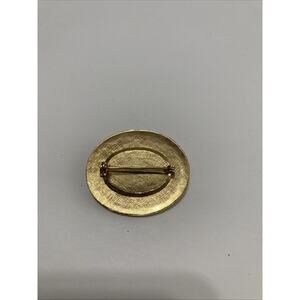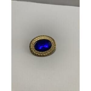 This beautiful blue stone set in a gold Art deco setting is a vintage brooch oval-shaped main stone is glass with a blue color set in yellow gold-plated mixed alloy. The piece is 1.5 inches in length and features a bezel setting style, making it a unique and stylish accessory for women who appreciate art-themed jewelry.