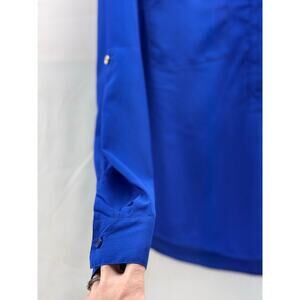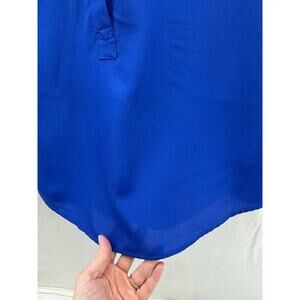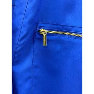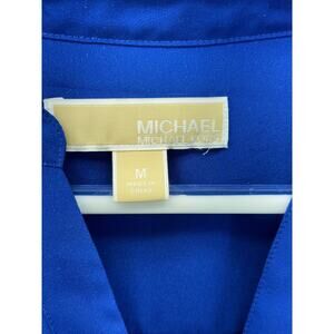 Good condition Beautiful Blue flowy Michael Kors with gold zippers blouse medium their is a slight difference in color in one spot can’t hardly see it but it’s there slightly.