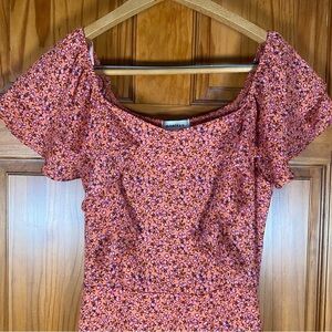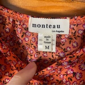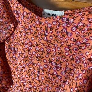 This dress by Monteau Los Angeles is in exceptional condition! It is in a beautiful coral color with fuchsia and lavender color floral patterns. Bohemian style with ruffled bell sleeves going down the chest!