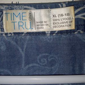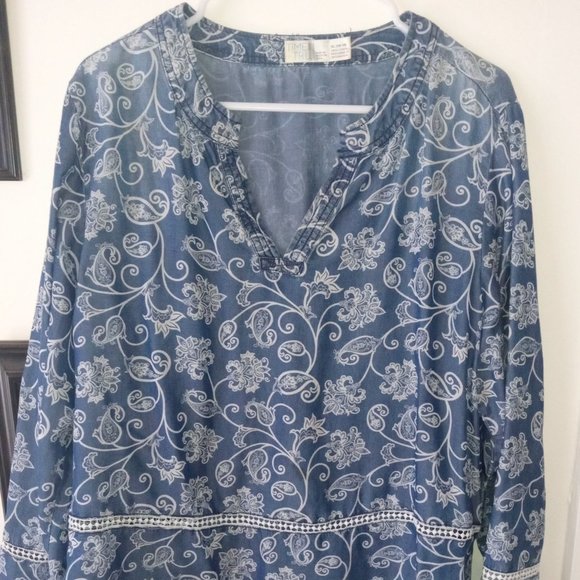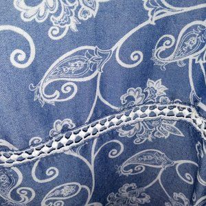 Very hippie paisley/floral print denim v-neck shirt by Time and Tru with lace accents on nice bell sleeves and around bottom of shirt...such a great boho look with jeans or a maxi skirt and boots. Marked as XL but so not, fits more like M/L..meant to have a flowy look to it