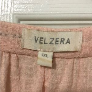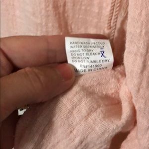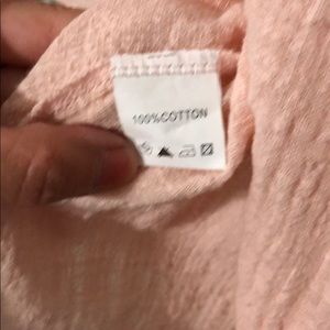 The fabric is cotton, but more like a linen cotton. Front has snap closures so you need a tank or camisole underneath. Peach/light pink color.
