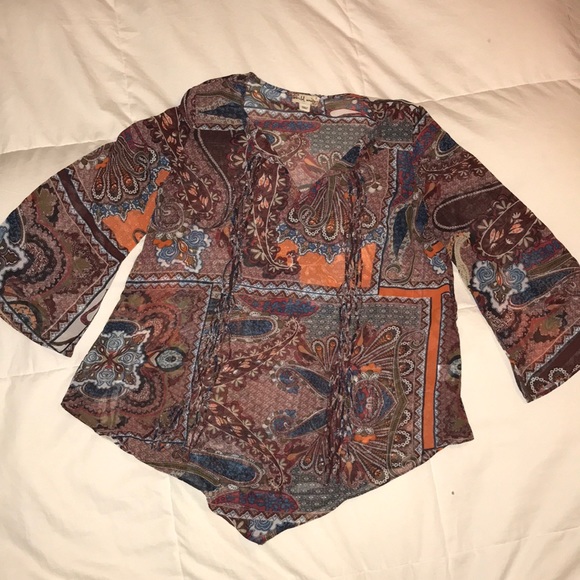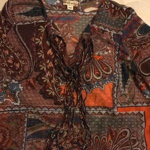 This is a sheer multi colored blouse with unique string ties in the front. This can be worn with a pair of jeans or a dressy pair of pants.