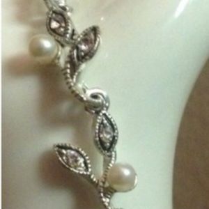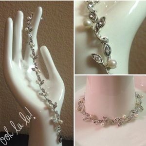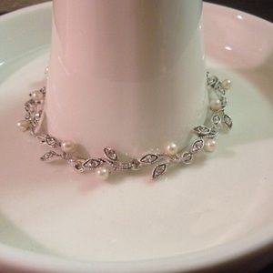 This is perfect for a night out on the town, wedding, or fancy occasion! Faux pearls and diamond like jewels set in silver tone. Pearls are the flowers, and the leaves are the gems. Style looks elegant with a slight filigree motif. Note: I bought this from Burdines (Macys) back in 1998! So this has not tarnished at all nor have any of the jewels or pearls changed in color! Looks just like it did when I got it for my HS prom ;) you will love this for special occasions! Length is 7 1/2 inch