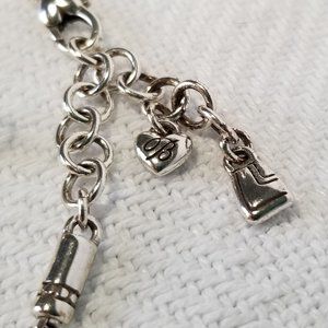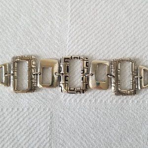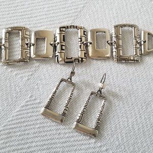 A Beautiful Retired Brighton Three Piece Jewelry Set. Includes: Necklace, Earrings & Bracelet. The Necklace is Reversible with Swarovski Crystals Added on One Side of the Pendant. Classic Brighton Silver-Plating with Etched Detail on Many of the Rectangular Pieces for Added Design. Wear it as a Set or Individually to Give any Outfit Just the Right Look. Necklace is 16"-18" with Adjustable Extender. Bracelet is 7"- 8" with Adjustable Extender. Earrings 2". Pre-Loved & In Pristine Condition.