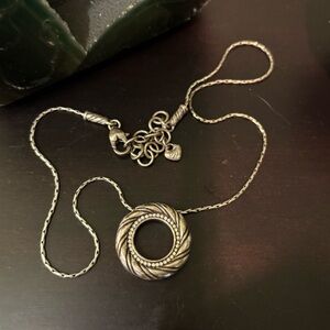 This is a gorgeous Brighton necklace, silver and brass with tiny rhinestones embedded on one side it’s reversible. The other side is brass dress it up or wear it casual.