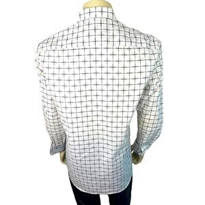 This stunning, versatile black and white long sleeved casual button down is perfect for work, happy hour or catching a movie. It's high quality 100% cotton, from Bugatchi a shaped fit with a black and white grid pattern, and complimentary fun fabric inside the collar and cuffs with multicolored fish, and finished with white mother of pearl buttons. The size XL measures as follows: