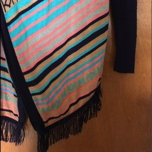 Beautiful cardigan sweater. Navy blue with Aztec design in tan, teal, and coral. Long sleeves. Slight piling.